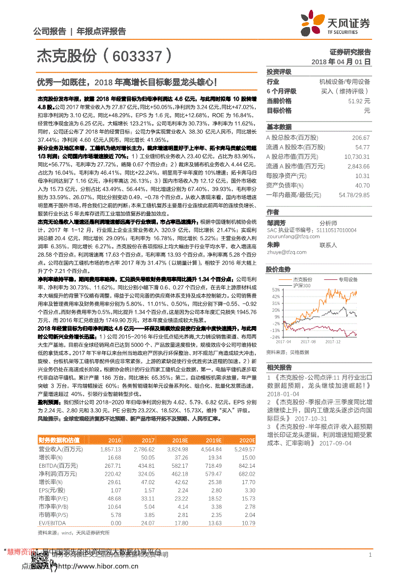 天风证券*公司研究*优秀一如既往△★,2018年高增长目标彰显龙头雄心!--杰克股份(603337)公司报告年报点评报告 1 杰克股份(603337) 证券研究报告2018年04月01日投资评级行业机械设备/专用设备6个月评级买入(维持评级) 当前价格51.92元目标价格 元基本数据A股总股本(百万股) 206.67 流通A股股本(百万股) 54▪▼▲.77 A股总市值(百万元) 10,730.31 流通A股市值(百万元) 2◁●,843.66 每股净资产(元) 10.31 资产负债率(%) 40•.70 一年内最高/最低(元) 54.78/29□.85 作者 邹润芳分析师SAC执业证书编号:S04 朱晔联系人 资料来源:贝格数据相关报告1 《杰克股份-公司点评:11月行业出口数据超预期,龙头继续加速崛起!》 2018-01-04 2 《杰克股份-季报点评◇▷▼:三季度同比增速继续上升•,国内工缝龙头逐步迈向国际巨头》 2017-10-31 3 《杰克股份-半年报点评□△:收入超预期增长印证龙头逻辑,利润增速短期受累成本、汇率影响》 2017-09-04 股价走势优秀一如既往▽,2018年高增长目标彰显龙头雄心=▽! 杰克股份发布年报,披露2018年经营目标为归母净利润达4.6亿元••,与此同时拟每10股转增4▽-….8股。