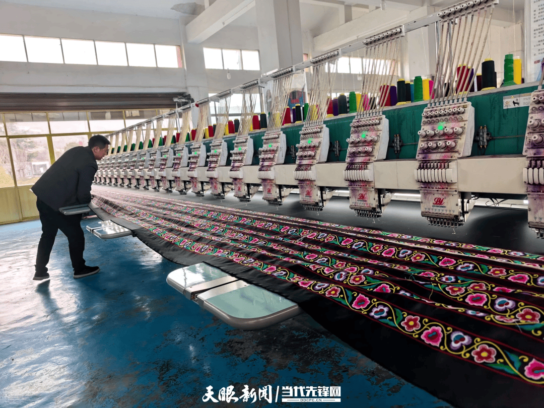 身旁的自动化刺绣生产线前,操作员文康按下按钮,绣花机飞针走线,转瞬便在布料上绣出精美的彝族传统纹样。不远处,工人们有条不紊地熨烫、拼接,指尖翻飞间,一块块布料化作精致的民族服饰。